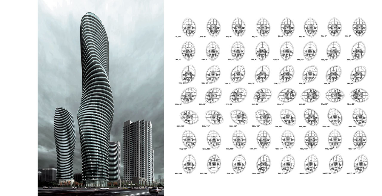 Las torres se alzan con 56 plantas (170m) y 50 plantas (150m). Los arquitectos explican que reflejan la fluidez y las lineas naturales presentes en la vida, pero el paisaje urbano carecía de carácter propio, por ello aportaron algo naturalista, delicado y humano, en contraste con los aburridos edificios rectangulares. Para crear estas formas onduladas y ofrecer mejores vistas, cada planta está girada entre 1 y 8 grados, apoyadas sobre muros de hormigón autoportantes. Vistas desde abajo, la deformación de las torres resulta muy llamativa. Dentro de la ciudad, las torres cobran protagonismo en un entorno insulso.