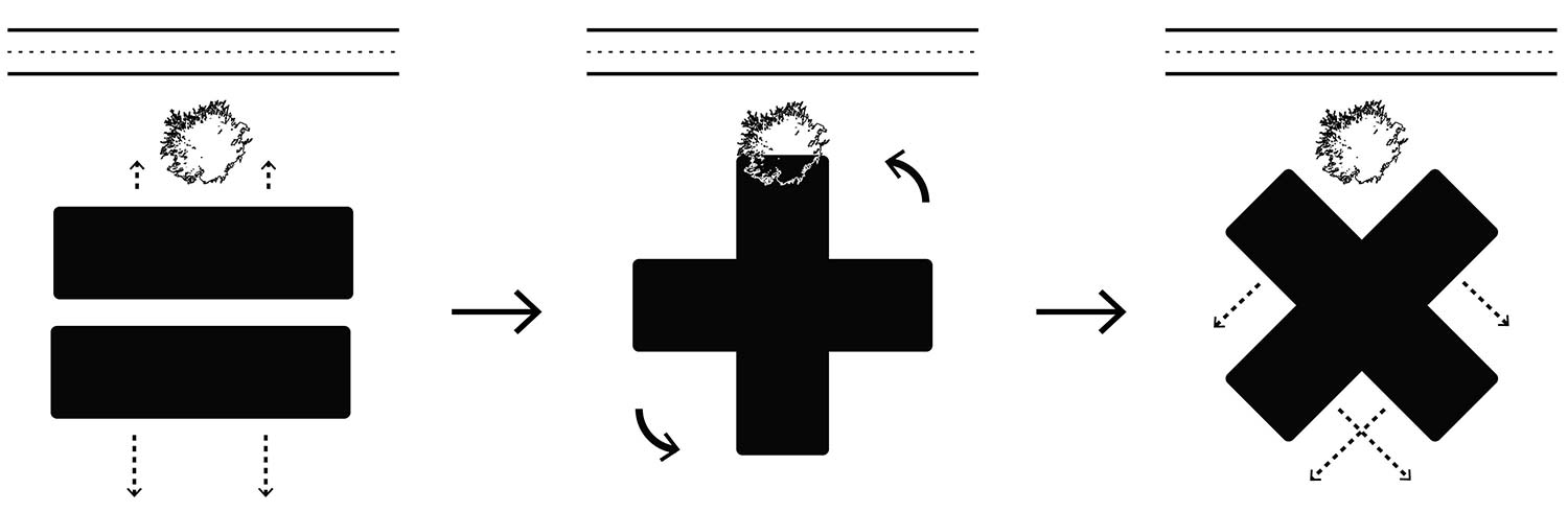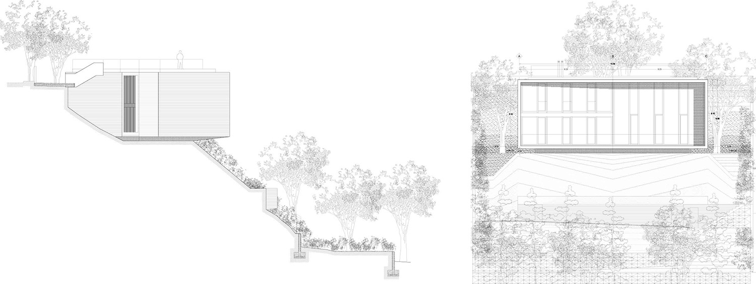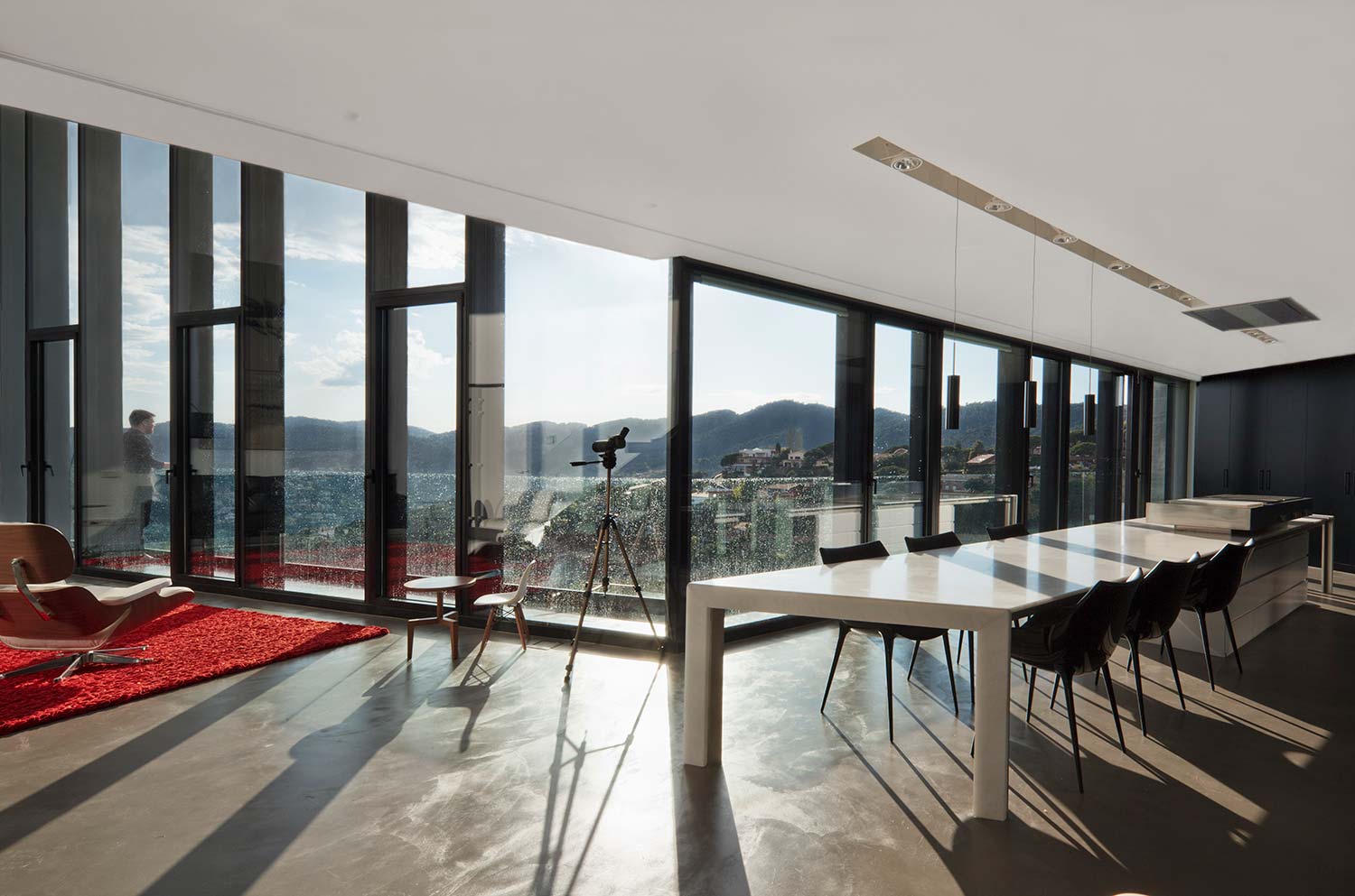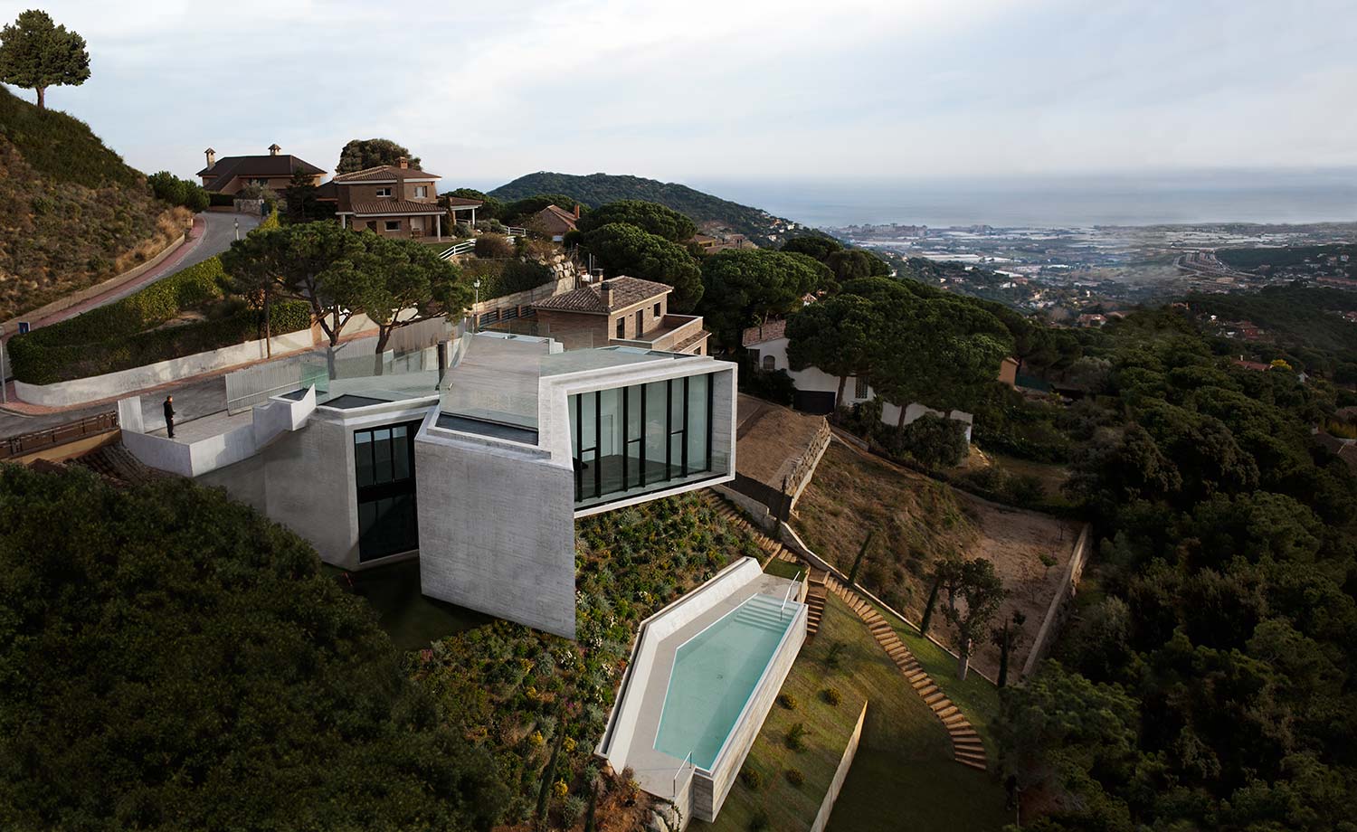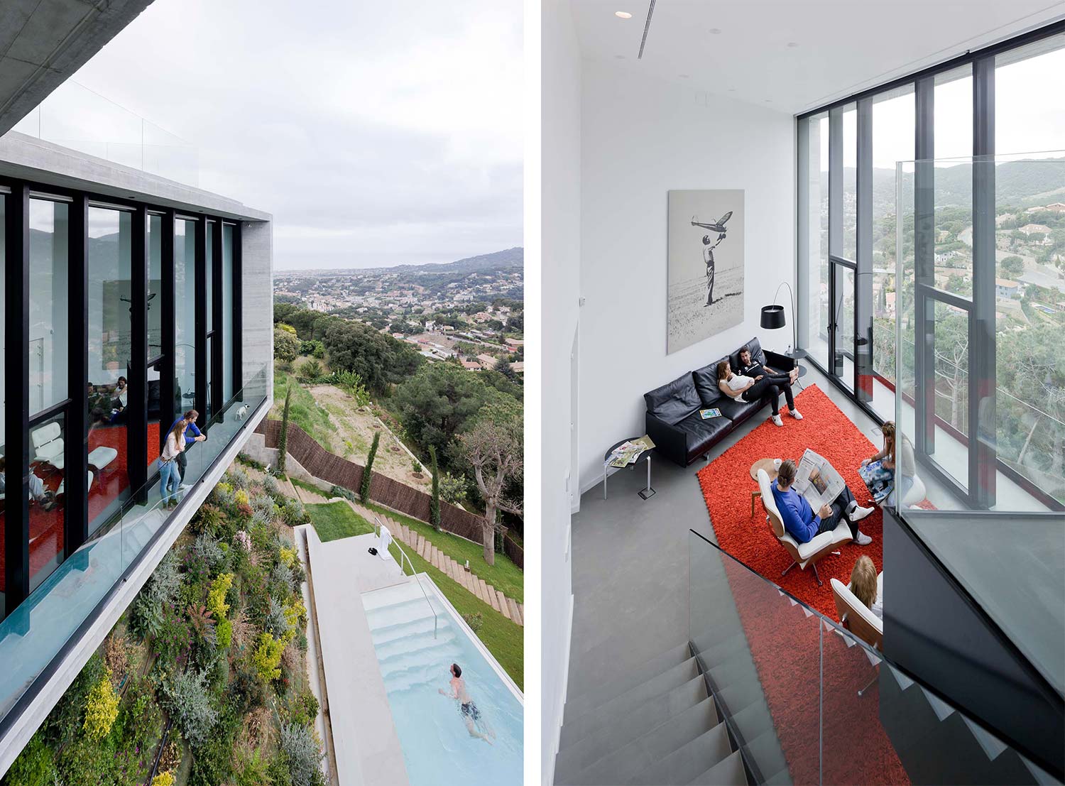 La vivienda como su nombre indica, tiene las plantas en forma de X. Las condiciones eran conseguir vistas al mar y a la montaña, adaptarse a la compleja parcela en pendiente, conseguir privacidad con los vecinos y preservar la vegetación. En la planta alta, situada 2m por debajo del nivel de la calle, se encuentra el aparcamiento, la zona de entrada y un dormitorio suite con vestidor, baño y estudio. En la planta baja, totalmente abierta por su parte delantera y con espacios en doble altura donde se situan la cocina-comedor y el salón, y en la parte trasera se sitúan 3 dormitorios. En el interior, paramentos y techos blancos, suelos de madera y amplios acristalados enfatizan tanto la luz que entra de fuera como las vistas del exterior.