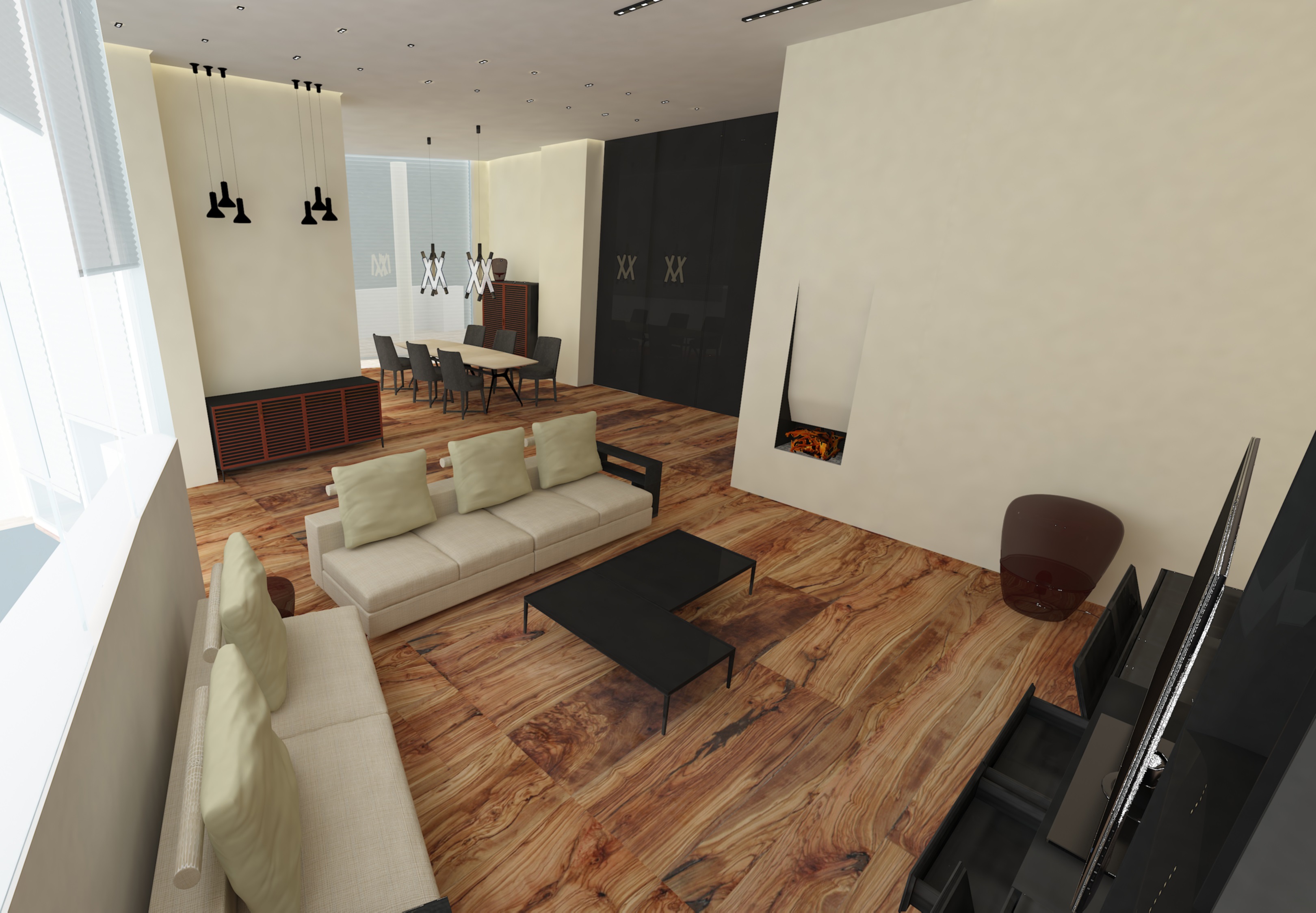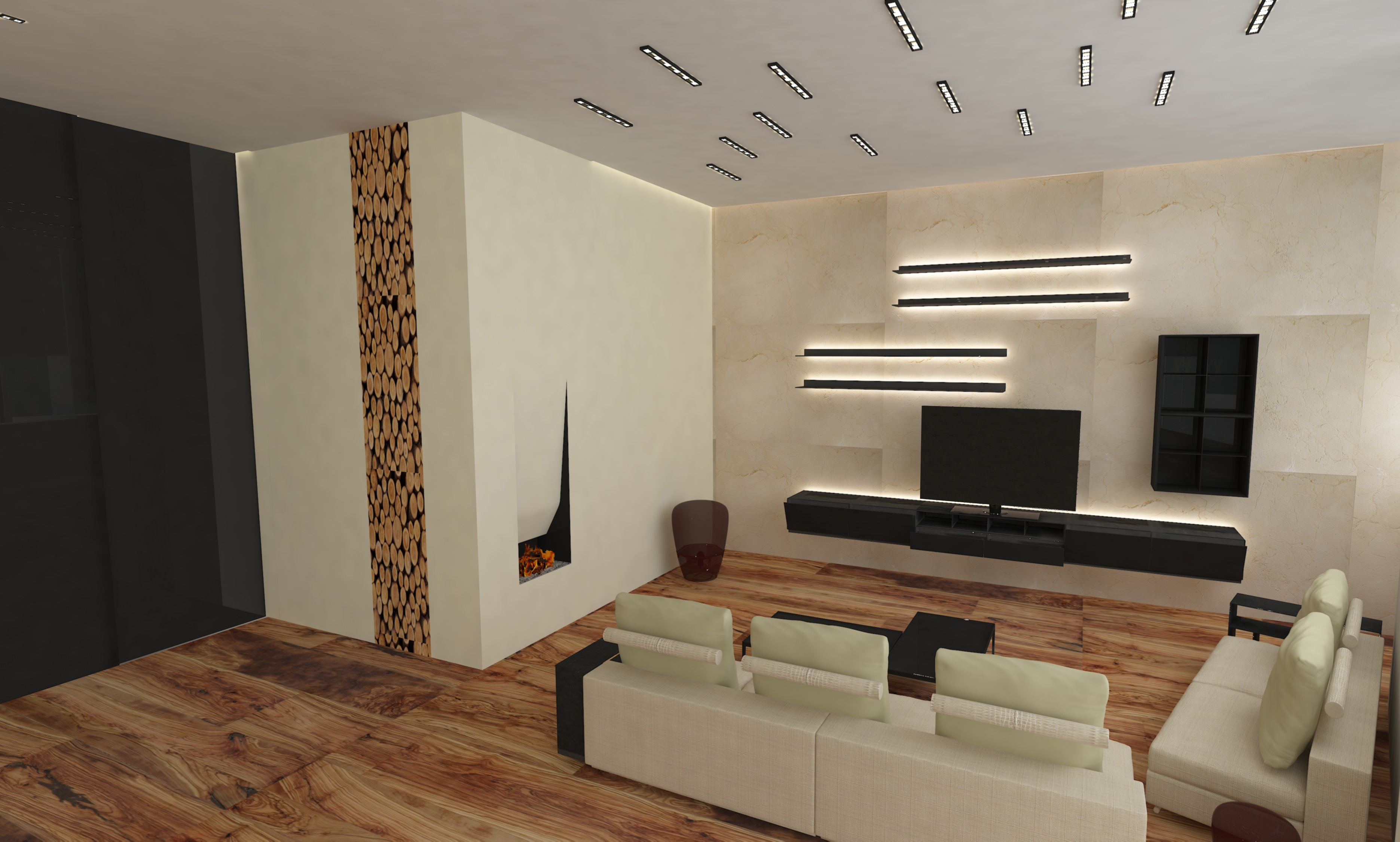 Para la zona del salón se propone un sofá modular para adpatarse a la morfología compleja del área. Con mesa central de aluminio y acabado en vidrio gris. En la pared con acabado en mármol, se propone situar las estanterías y muebles de TV, con retroiluminación. En una esquina se instala una chimenea de bioetanol de diseño exclusivo para caldear todo el ambiente, acompañado de una franja de troncos a modo decorativo.