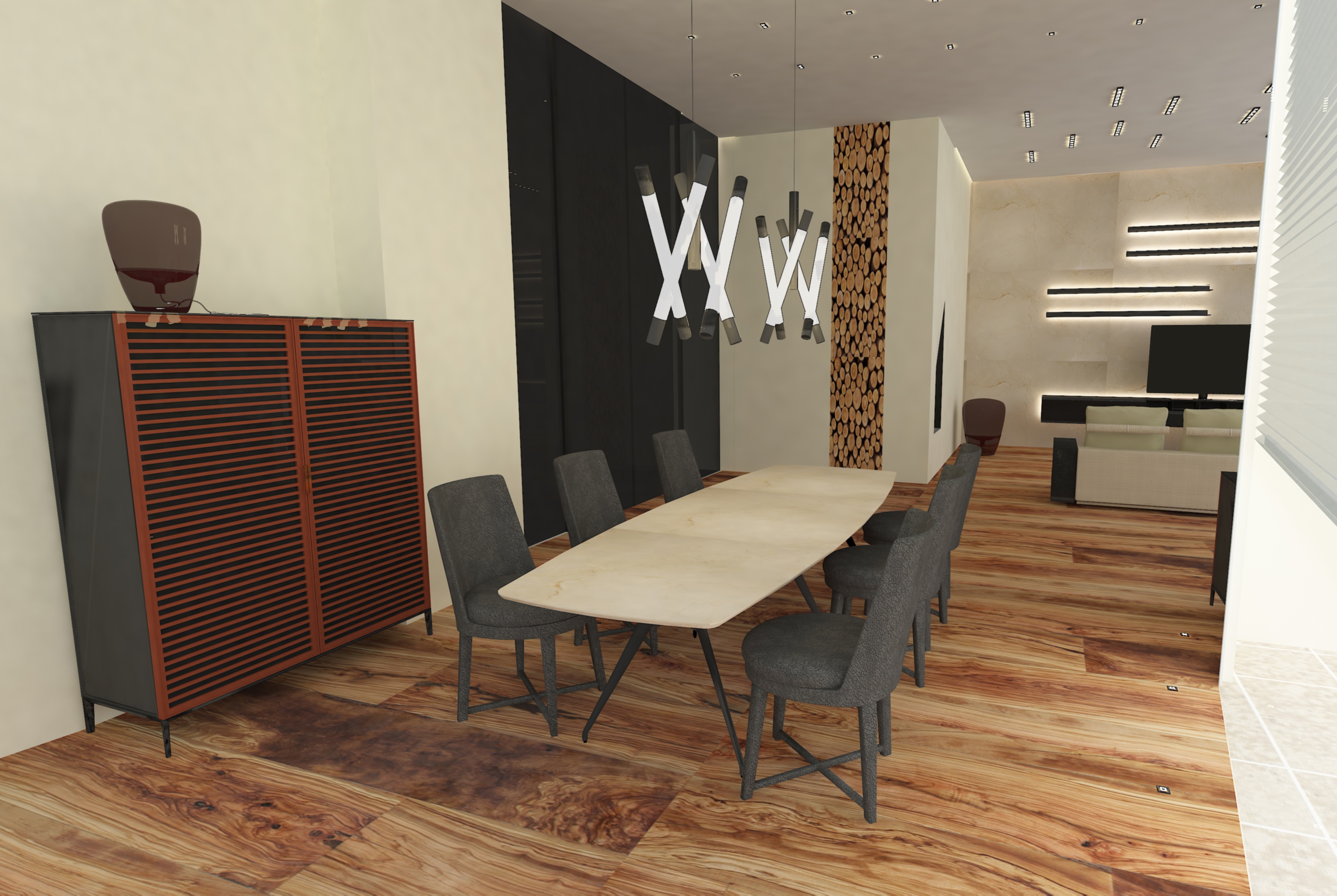 La parte del comedor se sitúa en la esquina superior, cerca de los grandes ventanales de suelo a techo que garantizan la buena iluminación natural. Se plantea una mesa de mármol y sillas de piel. Se acompaña con un aparador de estructura de aliminio con acabados en madera y vidrio gris, con frigorífico interior. Lámparas colgantes de diseño industrial y lámpara tipo bola decorativa.