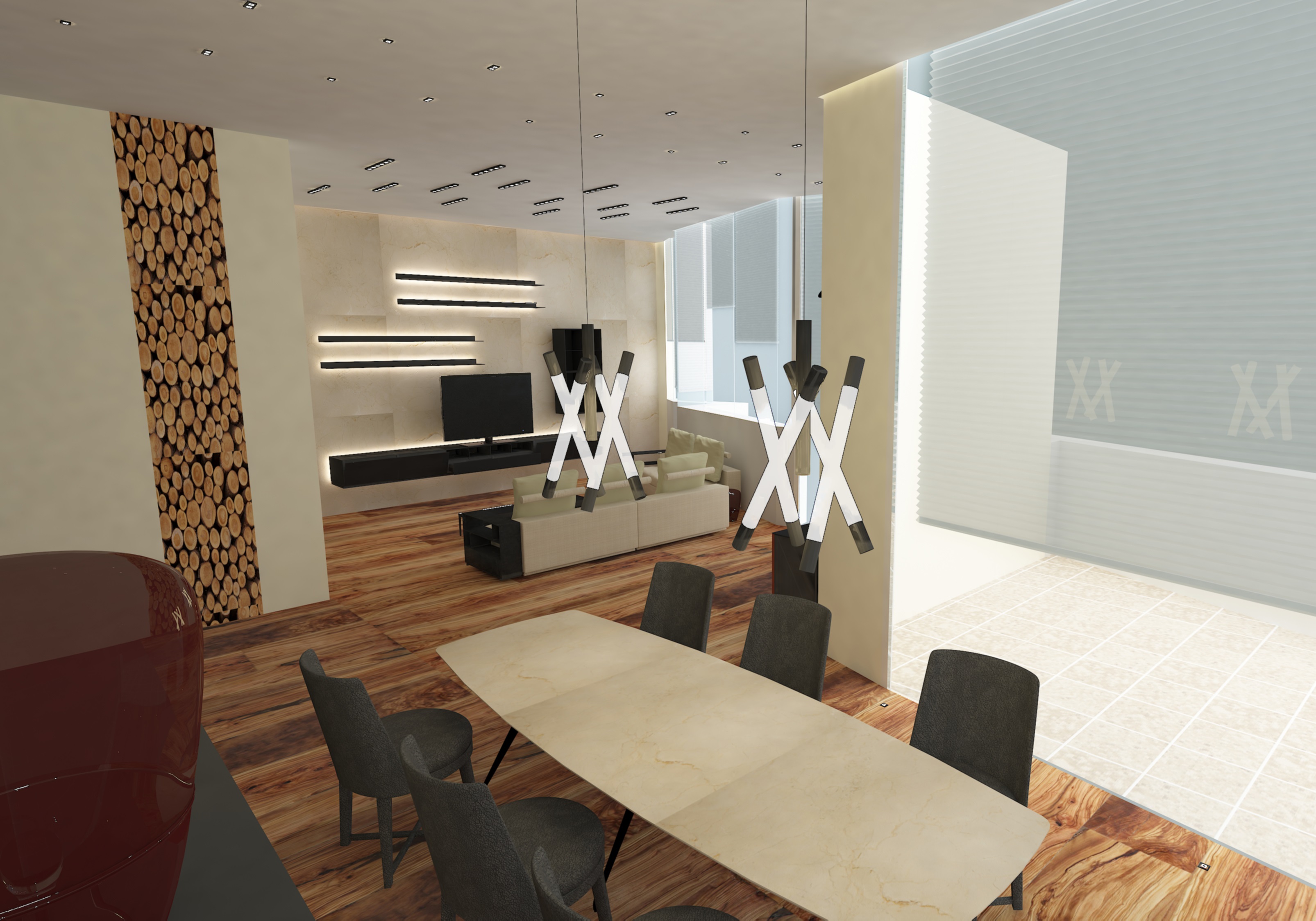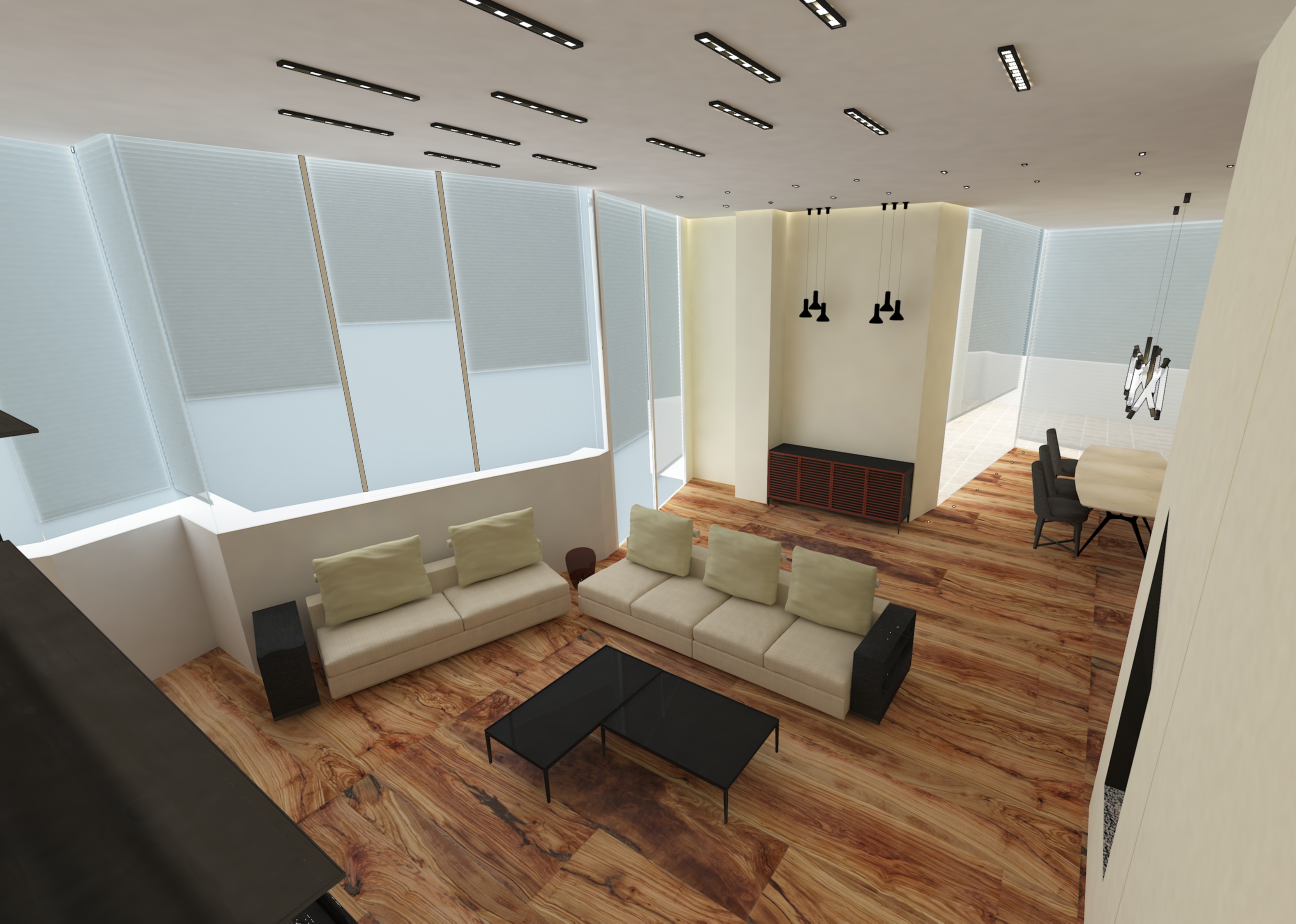 Todo el espacio tiene una iluminación perimetral oculta de ambiente. Además se proponen luminarias LEDs empotradas en techo de diferentes tamaños para delimitar y decorar los distintos ambientes. En el espacio central divisorio que da paso a las puertas de la terraza se coloca un aparador a conjunto con el del comedor, que es iluminado con lámparas colgantes de diseño en vidrio. Todas las ventanas y puertas están protegidas del sol gracias a las cortinas enrollables exteriores. El pavimento es tarima de gran formato de madera de roble.