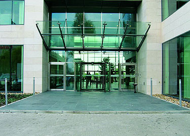 También para la protección de lluvia, se suelen colocar voladizos de vidrio para no interferir en la captación solar directa dentro del edificio. Ejemplos como éstos: