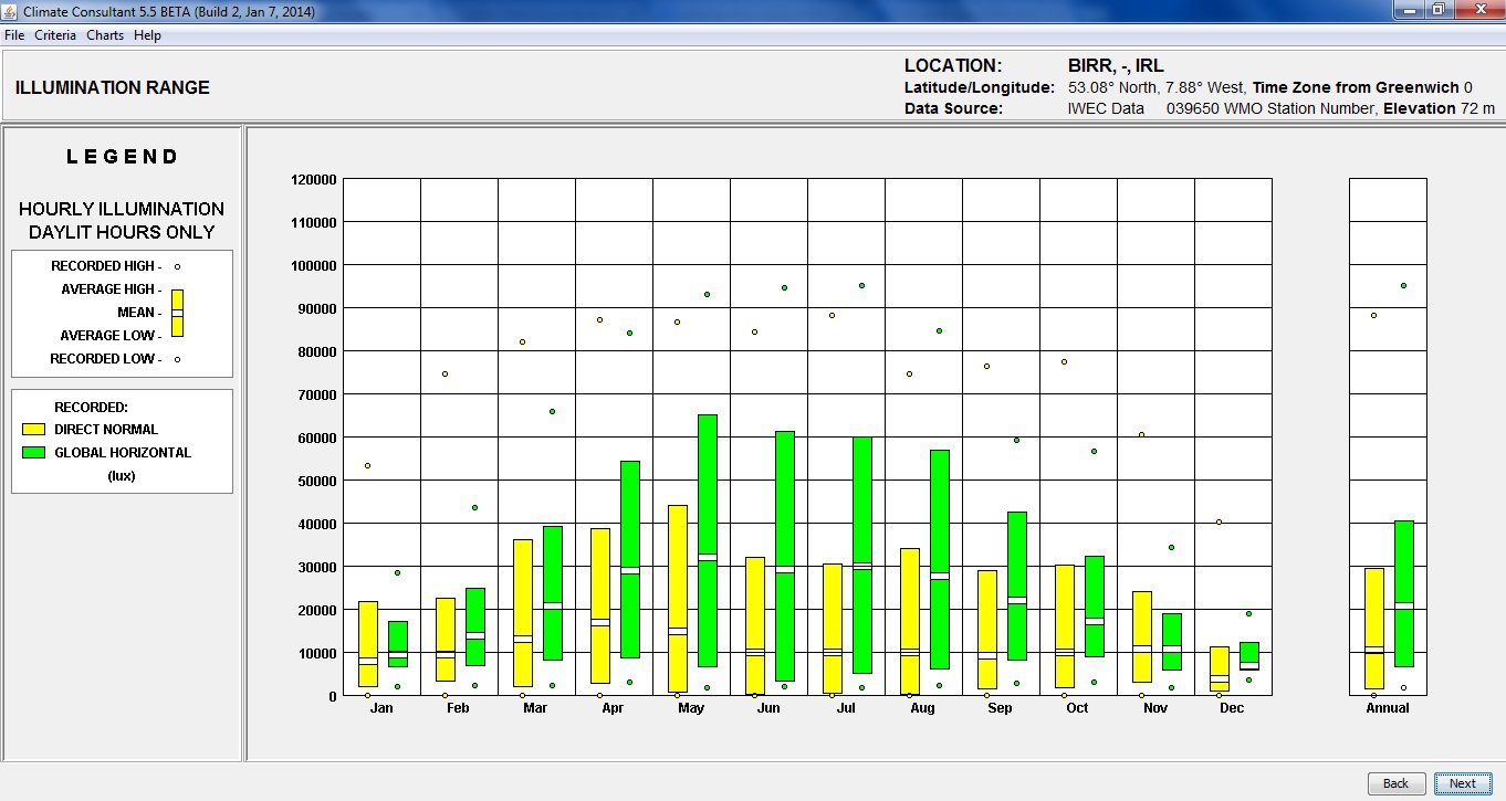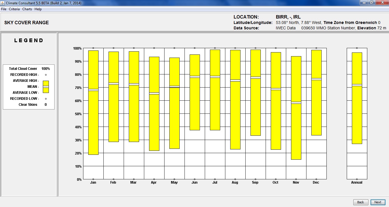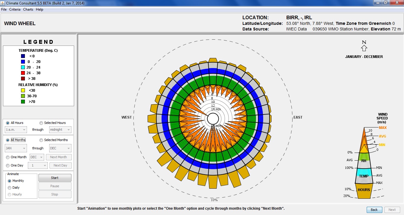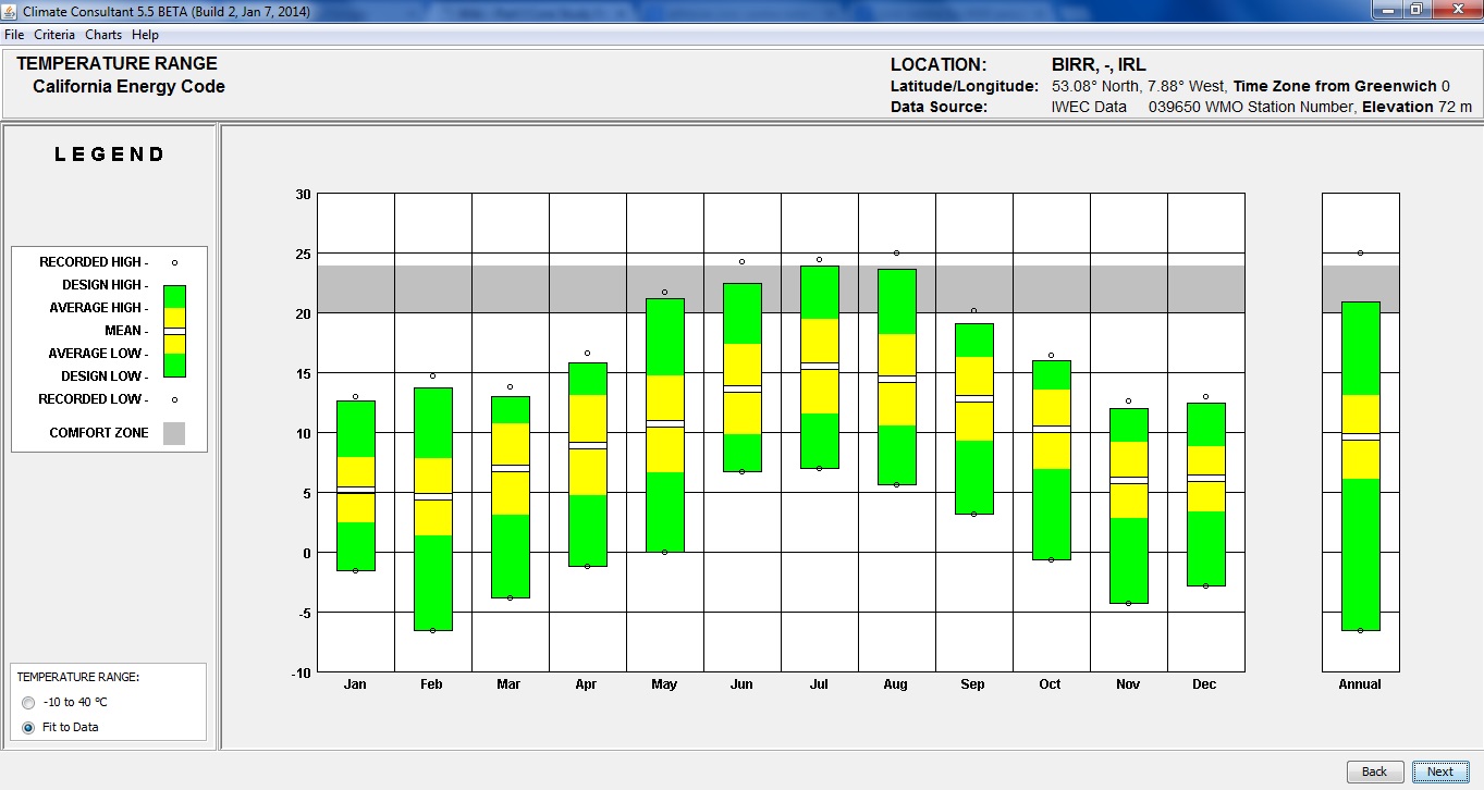 He utilizado el programa Climate Consultant, recomendado por uno de mis profesores, que podéis descargar y usar de forma gratuita de la universidad de California, Los Ángeles (UCLA). En concreto yo he tomado los datos climáticos de la región llamada Birr, en Irlanda, que es la que está más próxima y con datos climáticos similares a Claremorris.