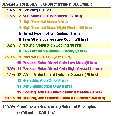Por último obtenemos la carta psicrométrica, donde además nos da una tabla con las horas de confort totales al año y las necesidades de climatización, en este caso podremos observar que el clima es frío y bastante húmedo, con lo que es necesaria calefacción en la mayor parte del año y simple ventilación en verano.