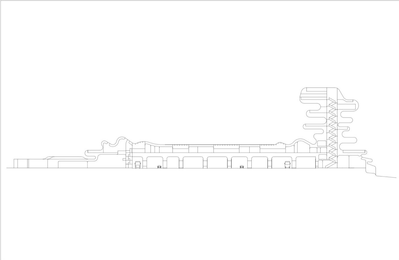 Es una estructura bastante abierta aunque parezca defensiva por su forma, siendo un edificio abstracto, no adopta una barrera ya que discurre paralelo a la carretera.