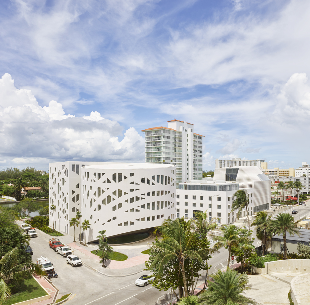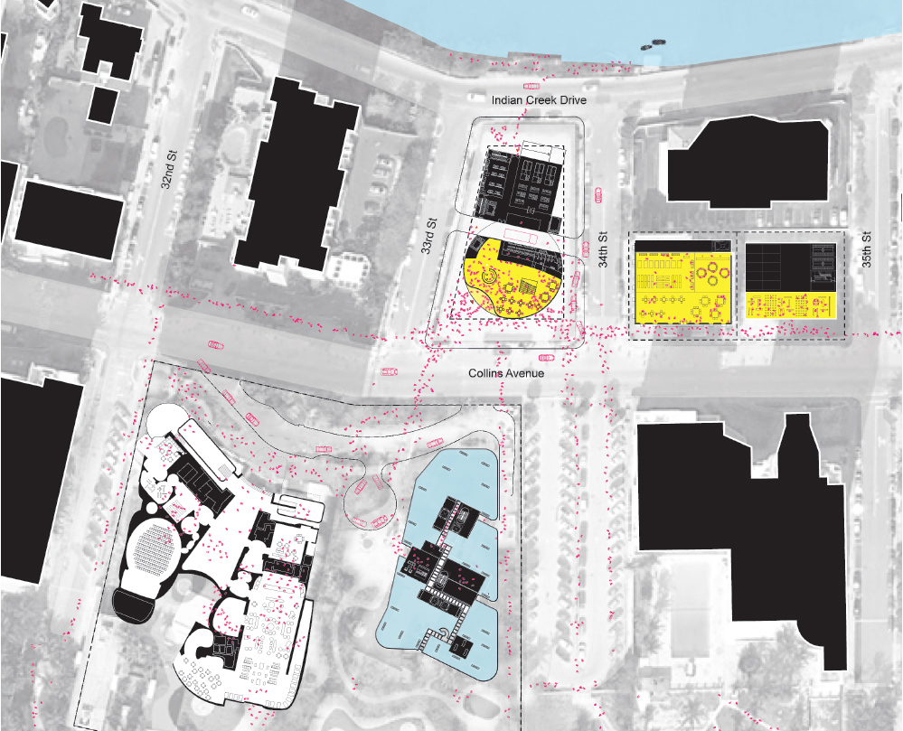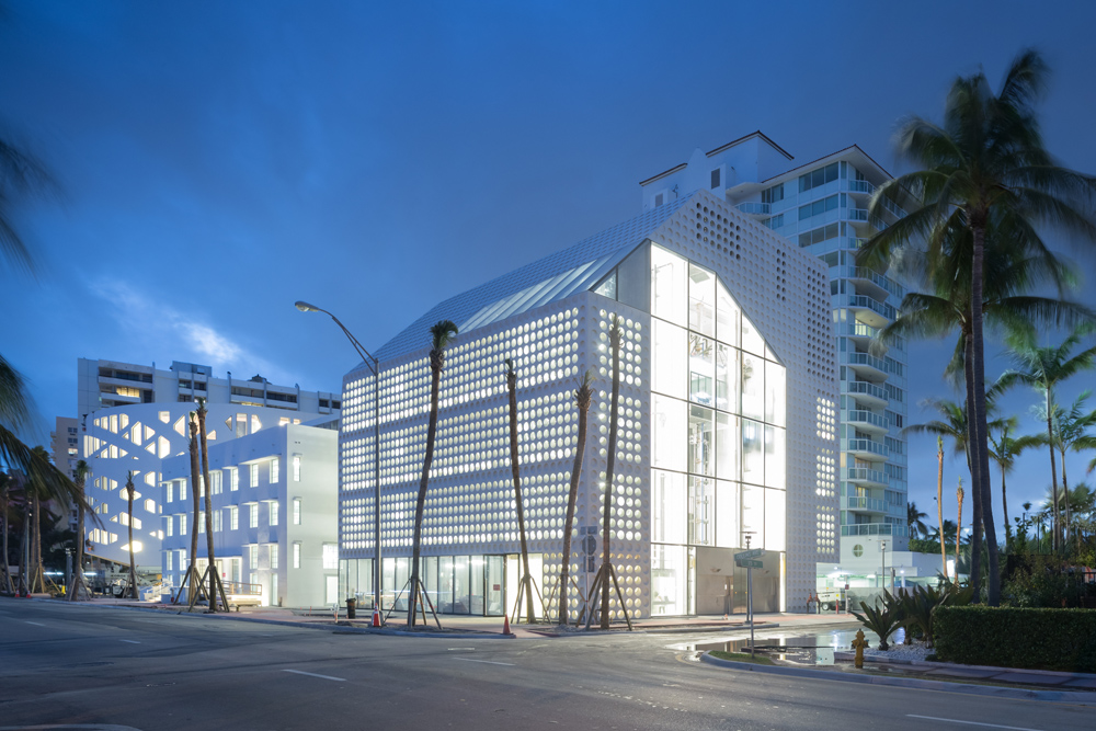 Situado entre Collins Av. e Indian Creek y la línea de playa del Atlántico, el complejo está formado por tres piezas diferentes: un centro de arte, un mercado y un aparcamiento, que están vinculados entre sí y se articulan a través del espacio público.